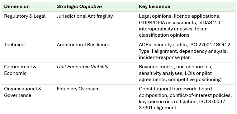 Investors will expect to see data protection impact assessments (DPIAs) under GDPR or equivalent frameworks, evidence that the project has considered eIDAS 2.0 compliance for digital identity wallets, and legal opinions on the classification of any token or digital asset the project issues or handles.